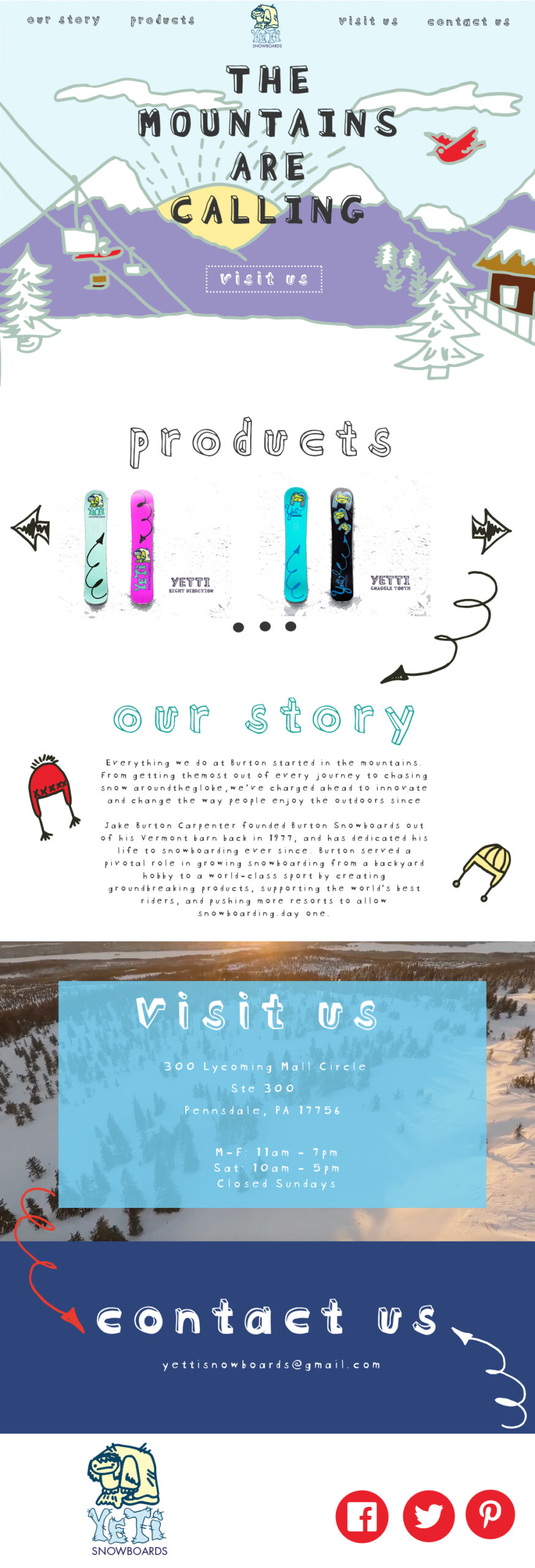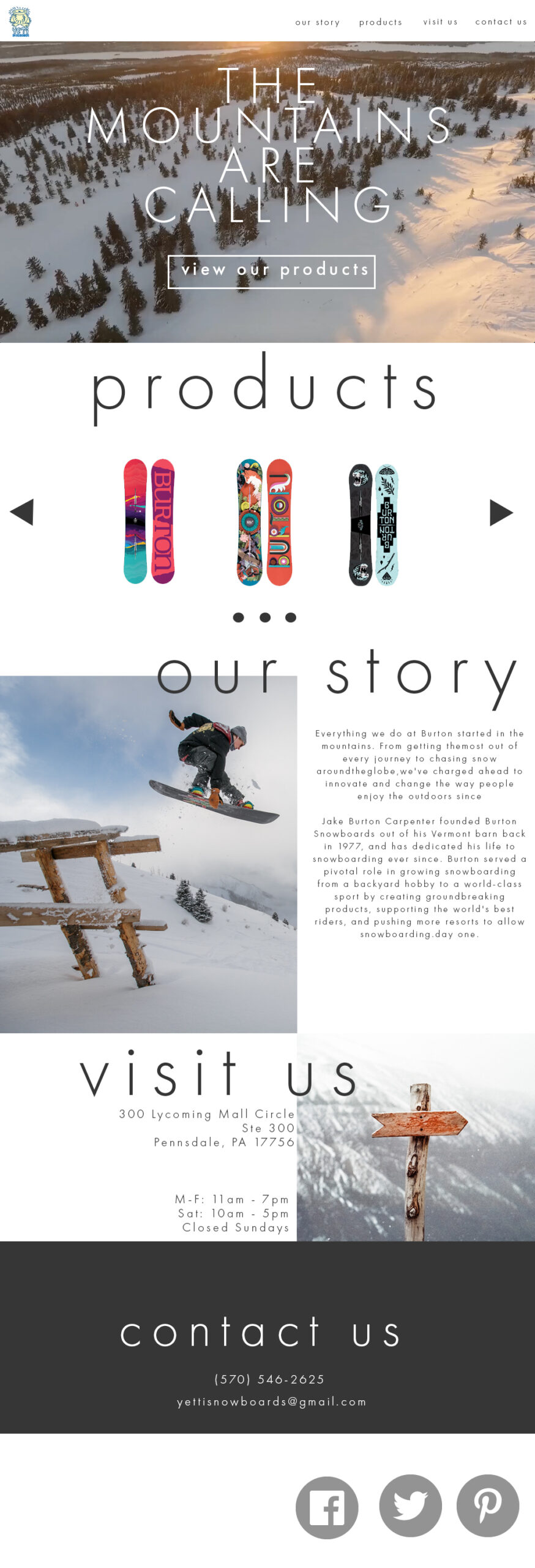 Yeti is a snowboarding company with a retail shop. The website was created to display products and encourage visitors to the location.